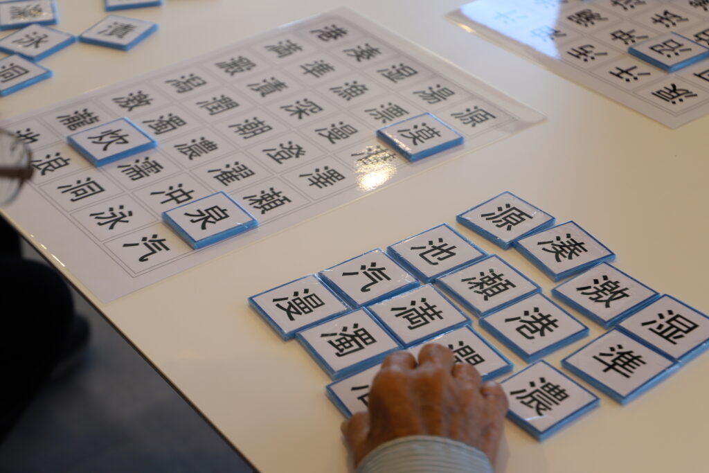 スタッフ手作りの「さんずい」や「魚へん」の漢字パズルに挑戦しました。皆さま真剣に取り組まれ、会話もなく黙々とパズルに向き合っていました。完成の瞬間には笑顔と拍手があふれ、大変盛り上がりました。