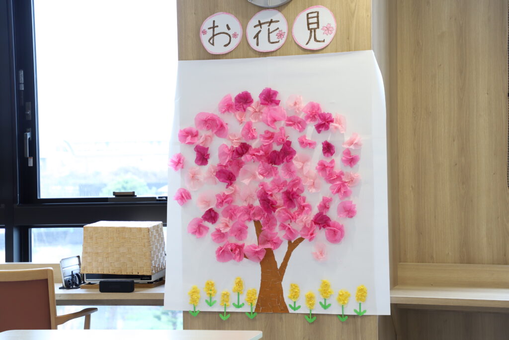 当初は外で桜を見る予定でしたが、あいにくの雨とまだ開花前だったため、館内に1本の桜の木を咲かせました。大きな模造紙に、4色の花紙で作った桜の花を一つひとつ貼り付け、皆で協力しながら満開の桜の木を完成させました。さらに菜の花も加わり、春らしい明るく華やかな作品に仕上がりました。